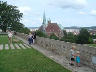 Today we day tripped to Erfurt with the family for lunch and a spot of walking. Lunch was taken at a fabulous Indian restaurant where we had way too much food. A combination of chicken and vegetarian stuff (veggie for Mary and Adam who don't eat food with faces, except for potatoes who do have eyes from time to time) in the form of samosas and sauces to pour over delicious basmati rice, along with naan (Indian flat bread) left us all stuffed and slightly less eager for that walk we'd planned. However we did walk up to the top of some old German fortress (no, I don't know the name. Saint Peter's something-or-other I think... ) and let the kids run around for a bit. I took part in some escorting of my niece around the top, which is mostly just a wall with some grass and broken down old walls in the middle. The view from the top is mostly of the red-roofed town of Erfurt, so I didn't walk away with any actual pictures of the fortress...